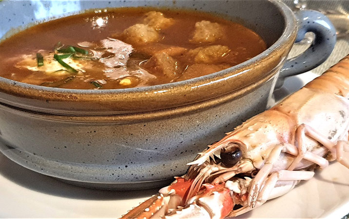Häll upp soppan i tallrikar, fördela kräftköttet och lägg i tallrikarna. En hel kräfta läggs intill varje sopptallrik. Servera med en klick crême fraiche, lite hackad gräslök och en lätt touch med cayennepeppar. Lägg också i lite krutonger.
