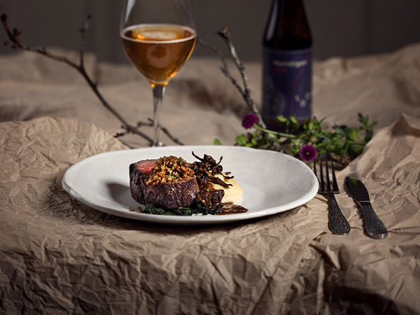 Hörökt älgytterfilé med enbärscrust, stekta trattkantareller, rotselleripuré, svartkål och rödvinssky