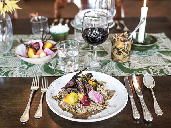 "Köttet har en tydlig viltsmak, och får en liten sötma av gravningen. Då passar ett lite mjukare rött vin med hög fruktsyra, d v s vinet tar inte över hela upplevelsen."