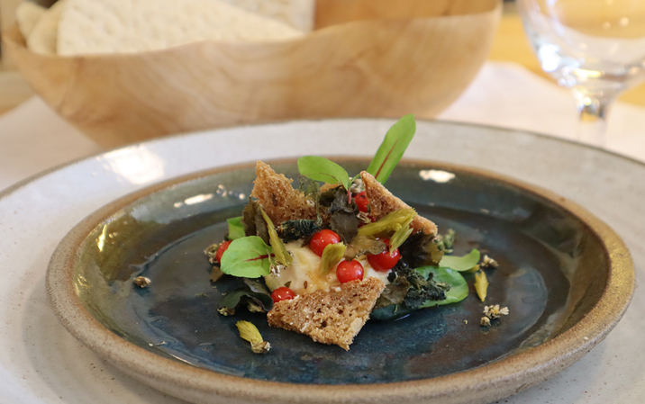 Ostkräm med granskottsmarmelad, torkat grötbröd och skogssallad