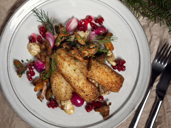 Kantarellstekt abborre med gräddkokta kantareller, potatisterrine och picklad lök