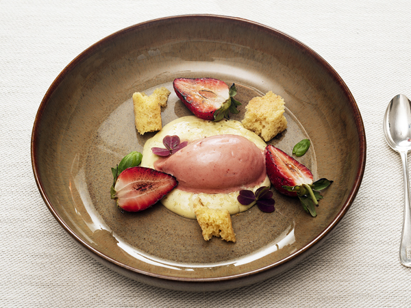 Brönd basilikakräm med mandelkaka, grillade jordgubbar, fläder och smultronsorbet
