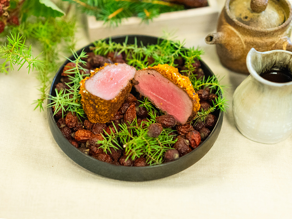 1. Servera rotsaksterrinen med skogens vilt eller en isterbandslik rökt korv.