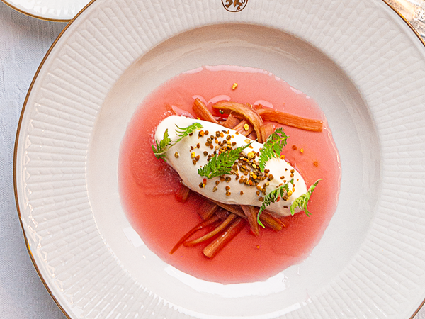 Kyld rabarberkompott med lättvispad grädde, bipollen, honung, spansk körvel och enkornsdröm