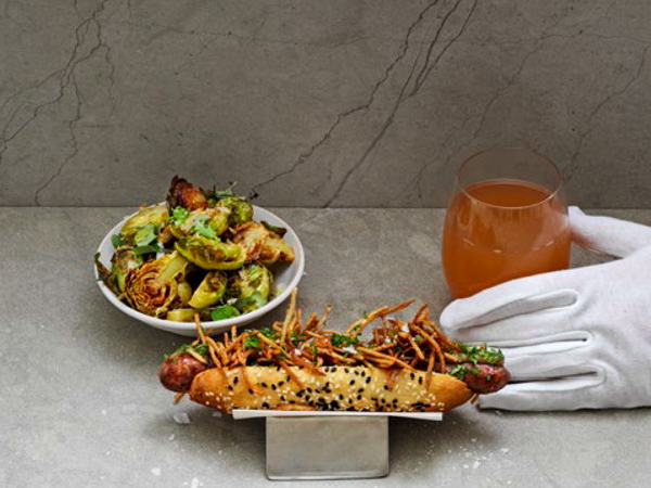 Stek korven gyllene i rapsolja. Fritera brysselkålen till önskad färg på 180 grader. Krydda med salt, peppar, citronzest och brynt smör. Fördela på fyra små skålar. Strö över persilja. Värm korvbrödet snabbt i mikrovågsugn eller ångugn. Lägg korven i brödet, spritsa på jordärtskockskrämen längs hela korven och garnera med frasig potatis och hackad persilja.
