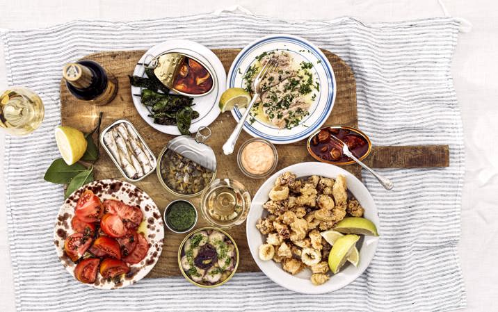De ofta vackra konserverna från Medelhavet blir effektfulla när du dukar upp dem på en skärbräda med lite gott rostat bröd, klyftade tomater med olivolja och några enkla såser. Köp konserver av god kvalitet, till exempel bläckfisk, tonfisk, sardiner, musslor. Tips: saluhall.se, salmantinos.se och självklart din närmaste saluhall eller delikatessbutik.