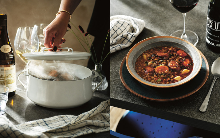 En traditionell spansk linsgryta med must och dova rökta smaker. Om man vill servera linserna någorlunda intakta eller mer mosiga är en smaksak. Det allra viktigaste är att man får tag på en äkta stekchorizo med mycket paprikasmak. Om man sedan väjer en mild sådan eller en mer chilihet är också en fråga om smak. Röda viner med höstliga frukttoner ger grytan ett smakligt lyft.