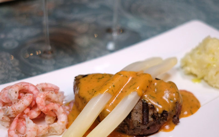 I denna lite lyxiga rätt får vi många smaker – kalvfilé förstås, sparris, räkor och en lyxigt god choronsås. Till denna kan man ha en liten potatisbakelse om man vill!