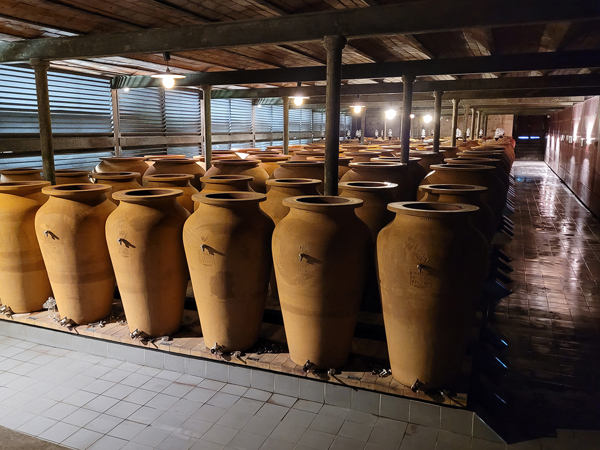 Nästa stopp på besöket bjuder på en stor överraskning: Gonzague visar stolt upp något unikt för Bordeaux – slottets omfattande användning av terrakottaamforor. Dessa köps från Tava i Toskana De bränns vid 1040 grader och måste ha precis rätt sandinblandning för att ge samma porositet som ekfat. Gonzague är noga med att hålla nere svavelhalten, då svavel kan försämra fruktspektrat och ge skarpare tanniner. Till förstavinet används en tredjedel amforor och två tredjedelar ny ek. De flesta amforor är på 320 liter men den största rymmer hela 750 liter. Totalt har man nu 180 amforor, där vinet får vila i tolv månader.