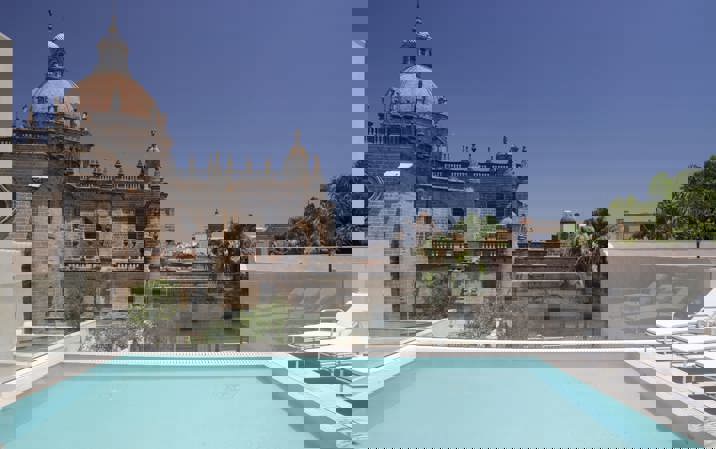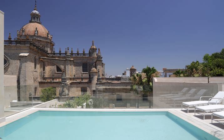 Vill du hellre ta ett glas sherry i någon annan stil tar du lämpligen hissen upp till Bar Terraza La Atalaya på hotellets tak, där soleran som är inrymd i den angränsande byggnaden aktiverar luktreceptorerna när vinden ligger rätt. Här uppe hittar du även poolen – och hela himlen över en av Andalusiens vackraste städer.
