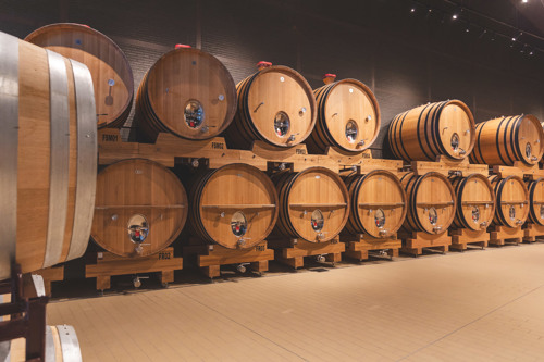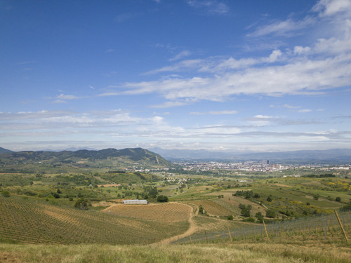 Från den moderna anläggning bjuds vi på en vidsträckt utsikt över landskapet som även inkluderar en del av de egna vinodlingarna som både växer på platån som ligger cirka 400 meter över havet, och även klättrar längs bergssidorna upp till runt 700 meter. De höga bergskedjorna som omsluter den vidsträckta högplatån där vi befinner oss, bekräftar känslan av att hela regionen är formad som en amfiteater. Några av de högsta topparna på över 2 000 meter dekoreras smakfullt med rester av snö. Det är andlöst vackert och vi förstår varför en av Spaniens mest välkända vinproducenter förälskade sig i trakterna och valde att förlägga delar av sin verksamhet just här.
