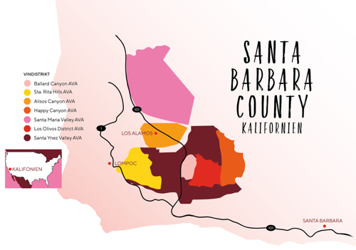 • Området är indelat i sju American Viticultural Areas (AVA), som alla har sina egna unika mikroklimat och jordmåner. De mest kända är Santa Maria Valley, Sta. Rita Hills, Ballard Canyon och Happy Canyon.