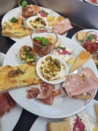Till detta serverades, som sig bör, en generös uppsättning rätter: bruschetta toppad med burratakräm och mortadella, en frisk ricotta- och citronkräm med zucchini och pistage, grillade grönsaker, klassisk skagenröra och en smakrik bläckfisksallad – tillsammans med en rad andra små läckerheter. Matchningarna satt oväntat väl, och visade återigen hur mångsidigt Prosecco kan vara vid matbordet.