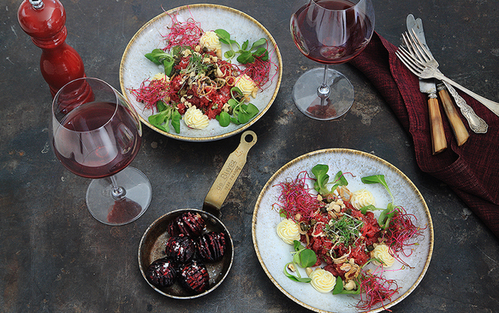 Utifrån en druvtypisk pinot noir från nya världen har jag komponerat en råbiff med tillbehör som alla passar väl ihop med vinet. Visserligen klarar det här vinet även en klassisk råbiff, men vad sägs om de här tillbehören: vispad briekräm, rostade hasselnötter, friterade lökringar och kapris. Vad mer som får stryka på foten är pommes frites. Istället blir det Hasselbacksrödbetor, är det skördetid så är det. Dessutom möter sötman i rödbetorna vinets fruktighet fint. Liksom den vispade briekrämen, pinot noir är ett vin som matchar vitmögelost fint och de rostade hasselnötterna tillsammans med vinets milda och rostade ekfatston känns klockrena.