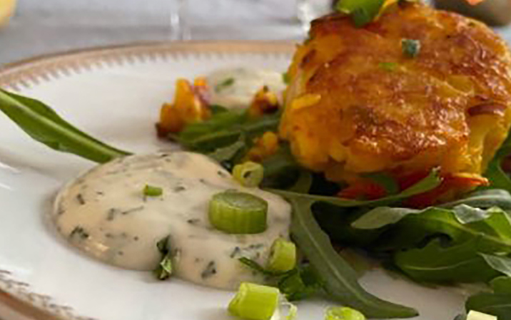Krabbröra med avokado och pepparrot toppad med tångrom och