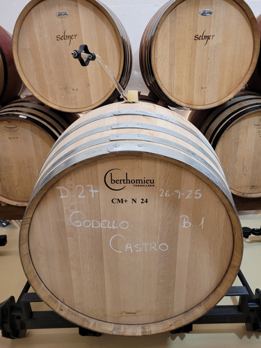 Druvklasarna kyls först ner till 5°C varefter de sorteras manuellt innan de avstjälkas och pressas försiktigt under inert atmosfär, det vill säga utan syre. Efter ett dygns sedimentering sker sedan jäsningen i stora rostfria tankar (150 hl) vid 15°C. Det färdigjästa vinet får sedan ligga på jästfällningen under 5 månader med regelbunden bâttonage. Vi fick provsmaka årgång 2024 som består av 90 procent godello (30–60 år gamla stockar) och 10 procent doña blanca (60–80 år gamla stockar) på 500–700 meters höjd. Ljus, halmgul färg med en blommig, lite vaxig doft med inslag av aprikos och citron med en drygt medelfyllig, balanserad smak med frisk fruktsyra i en simmig textur.