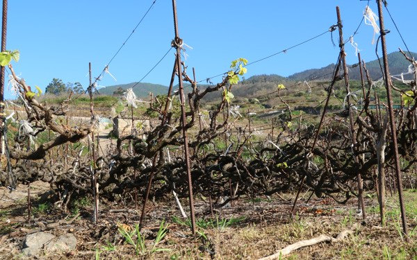 I de här delarna av Teneriffa, DO-områdena Tacoronte-Acentejo och Valle de Orotava, hittar vi mycket ålderdomliga uppbindningar (mer korrekt på spanska: sistema de conducción) av vinstockarna. De mest bekanta för oss munskänkar är förmodligen Cordon de Royat simple och double. Här hittar vi andra mer märkliga system, till exempel conducción de trenzado. I de här fälten tillämpar man två system varav ett är snarligt trenzado. Mitt namn på det systemet är cordon prolongado simple. Den består av en rot och en enda cirka tolv meter lång arm (trenzado ser likadan ut men är utav flätade armar). Här på orten kallas den enkelt bara för sistema tradicional. Det andra systemet heter espaldera, vilket innebär att en till synes vildvuxen buske binds upp åt båda hållen på ståltrådar.