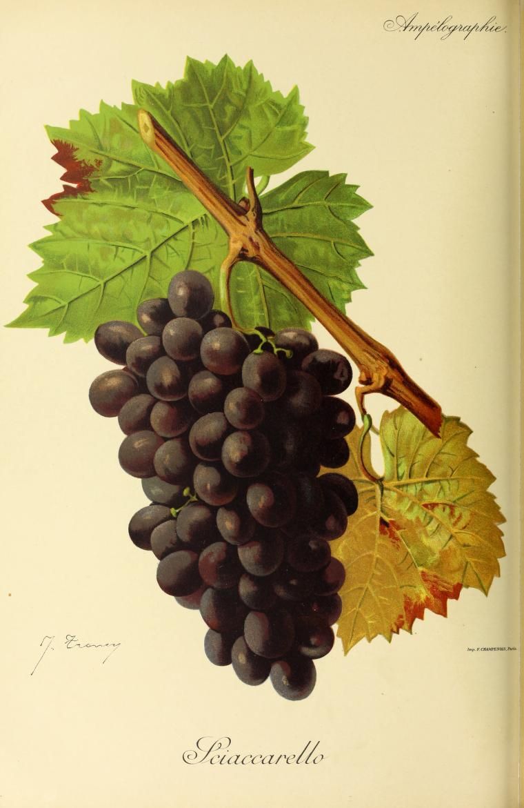 Blå druva som härstammar från Italien. Kallas även Mammola. Druvan mognar sent och är kraftig och känslig för botrytis. (Bildreferens: Jules Troncy i ”Ampélographie - Traité général de viticulture" (P. Viala & V. Vermorel), CC0, via Wikimedia Commons)