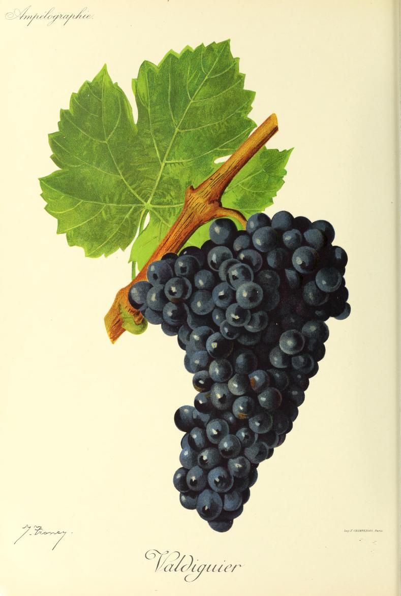 Blå druva som härstammar från Frankrike. Den ganska sent till sent mognande, högavkastande vinstocken är resistent mot mjöldagg. (Bildreferens: Jules Troncy i ”Ampélographie - Traité général de viticulture" (P. Viala & V. Vermorel), CC0, via Wikimedia Commons)